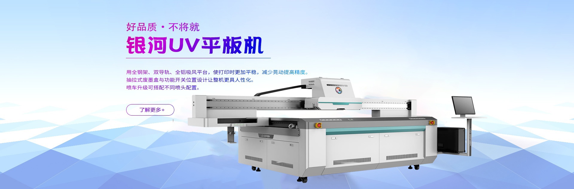 銀河F3系列UV平板機,采用全鋼架、直線導軌、全鋁吸風平臺,使打印時更加平穩(wěn),減少晃動提高精度。抽拉式廢墨盒與功能開關位置設計讓整機更具人性化。噴車升級可搭配不同噴頭配置,最適合自己,便是最好。 榮耀上市,煥然一新。
